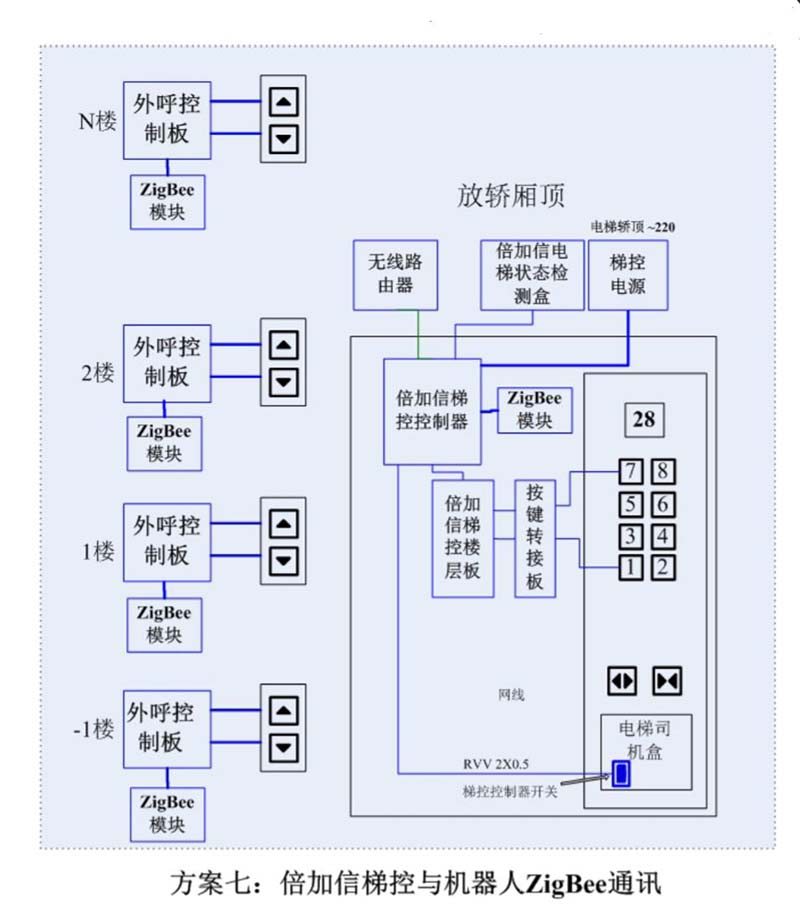 (1)機(jī)器人在電梯外,通個Wifi、藍(lán)牙、LoRa、Zigbee、2.4G、433M、語音或4G網(wǎng)絡(luò)等發(fā)送指令倍加信梯控系統(tǒng),系統(tǒng)自動點(diǎn)亮上樓或下樓按鍵,實(shí)現(xiàn)呼梯功能。