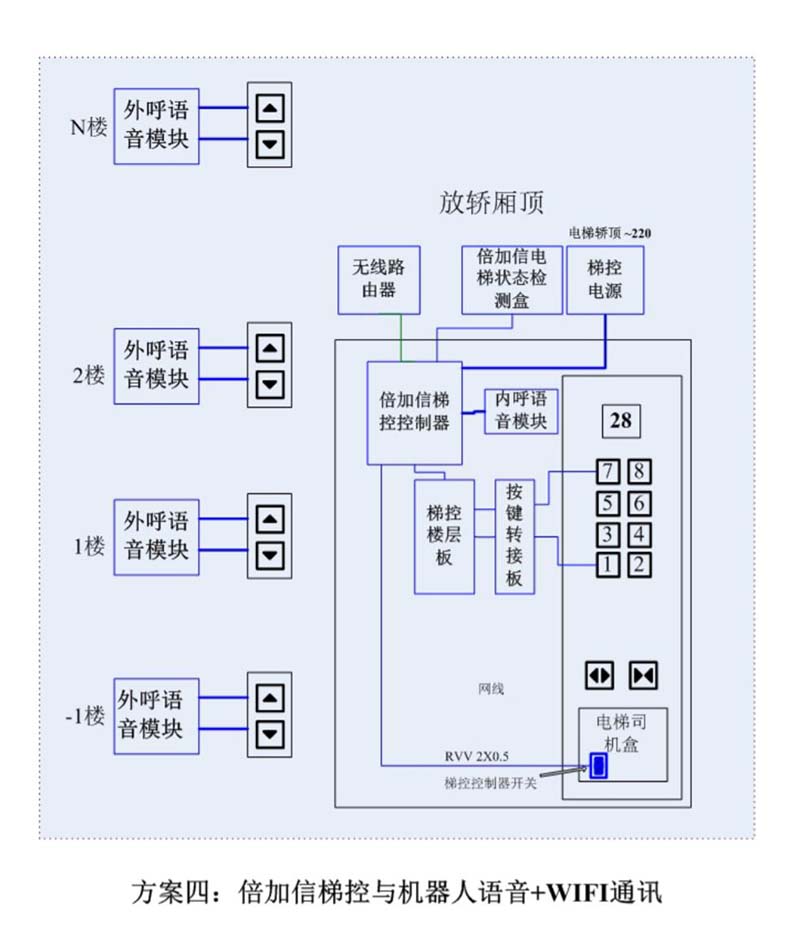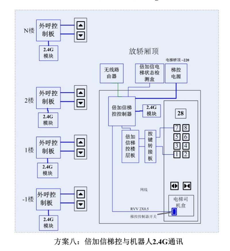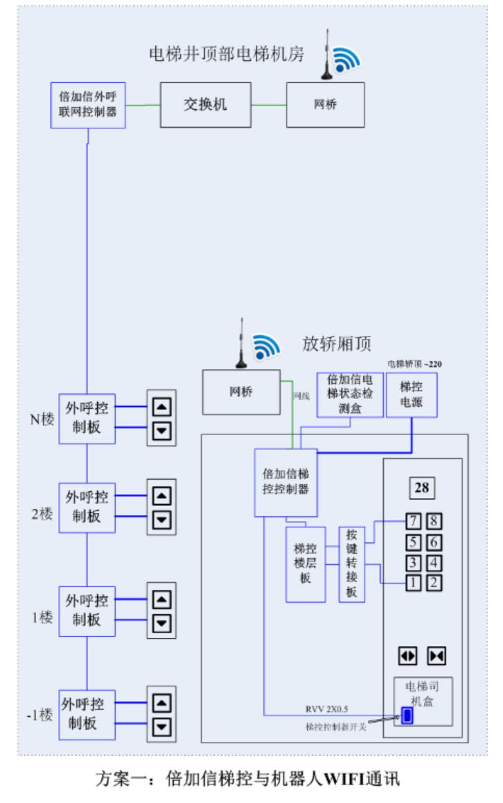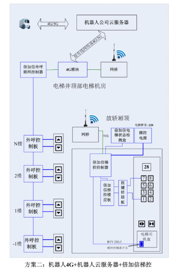 (1)機(jī)器人在電梯外,通個Wifi或4G網(wǎng)絡(luò)發(fā)送指令給倍加信梯控平臺,倍加信梯控云平臺收到指令后,將指令發(fā)給倍加信梯控系統(tǒng),倍加信梯控系統(tǒng)自動點(diǎn)亮上樓或下樓按鍵,實(shí)現(xiàn)呼梯功能。