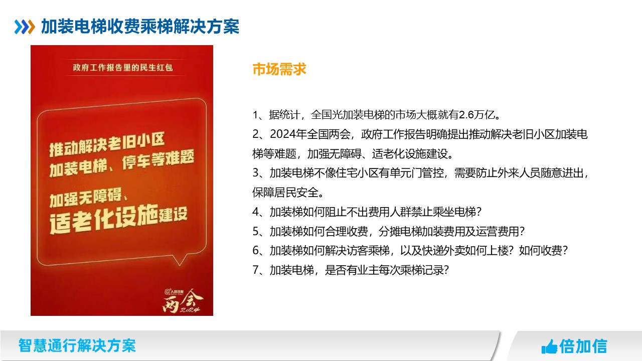 2、2024年全國(guó)兩會(huì),政府工作報(bào)告明確提出推動(dòng)解決老舊小區(qū)加裝電梯等難題,加強(qiáng)無(wú)障礙、適老化設(shè)施建設(shè)。