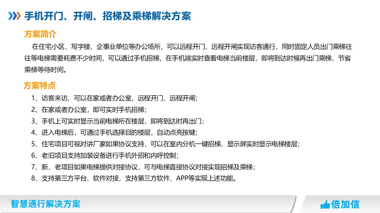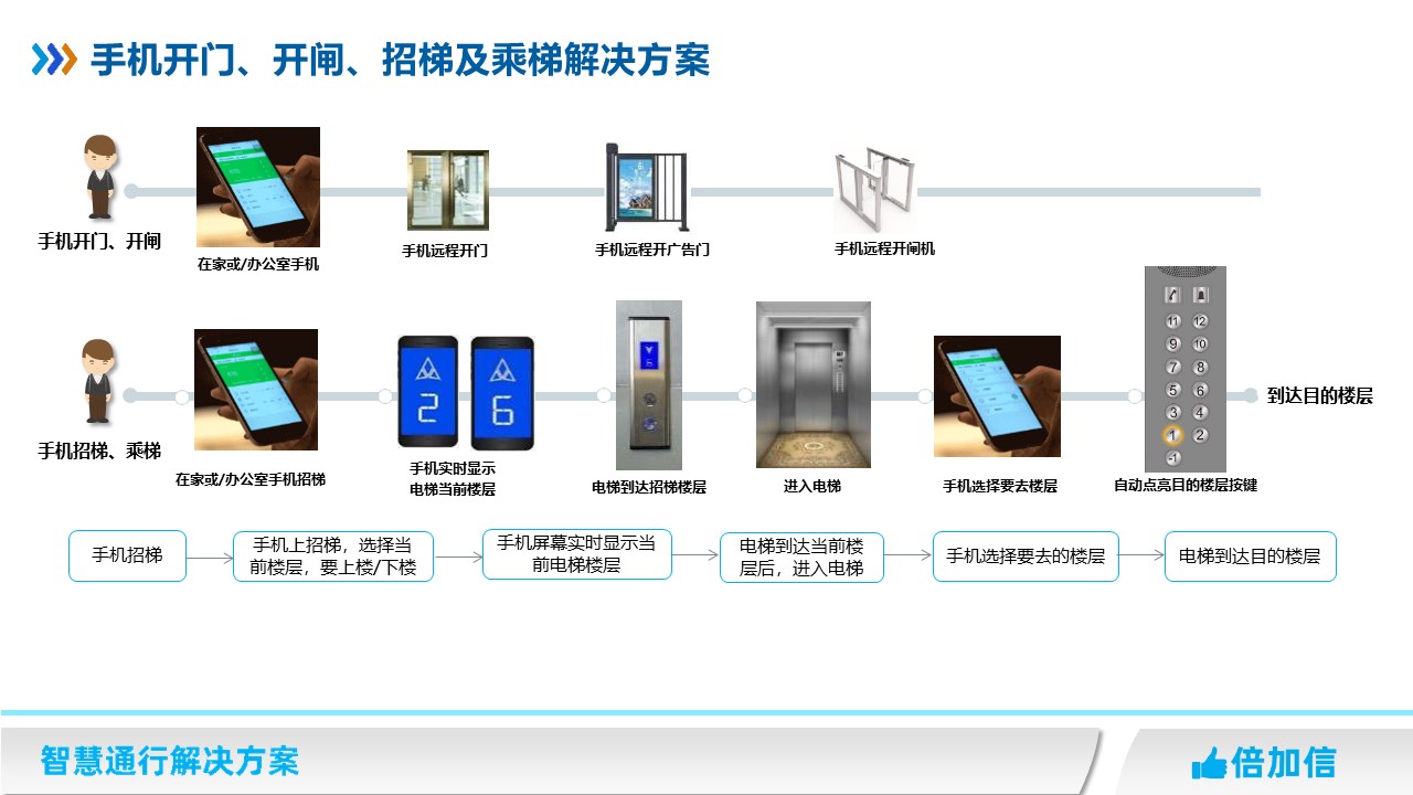 在住宅小區、寫字樓、企事業單位等辦公場所,可以遠程開門、遠程開閘實現訪客通行,同時固定人員出門乘梯往往等電梯需要耗費不少時間,可以通過手機招梯,在手機端實時查看電梯當前樓層,即將到達時候再出門乘梯,節省乘梯等待時間。