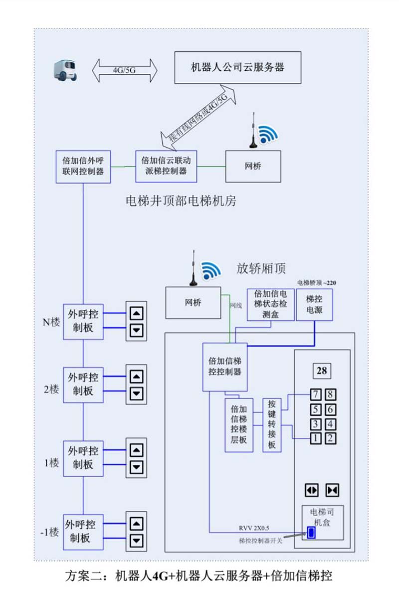 (1)機器人在電梯外,通過4G網絡等發(fā)送指令機器人云服務器,機器人云服務器再與倍加信梯控系統(tǒng)通訊,系統(tǒng)自動點亮上樓或下樓按鍵,實現(xiàn)呼梯功能。