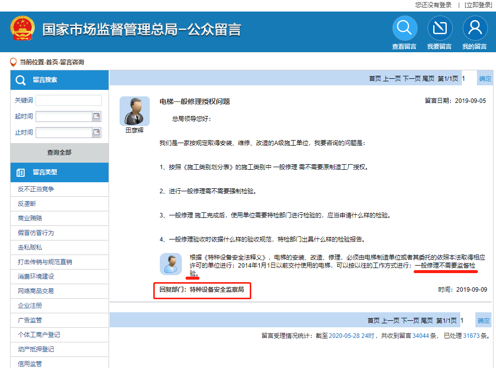 國家市場監督管理總局 特種設備安全監察局 回復:通過按鍵控制方式加裝梯控屬于一般修理,與電梯主板協議對接屬于重大修理