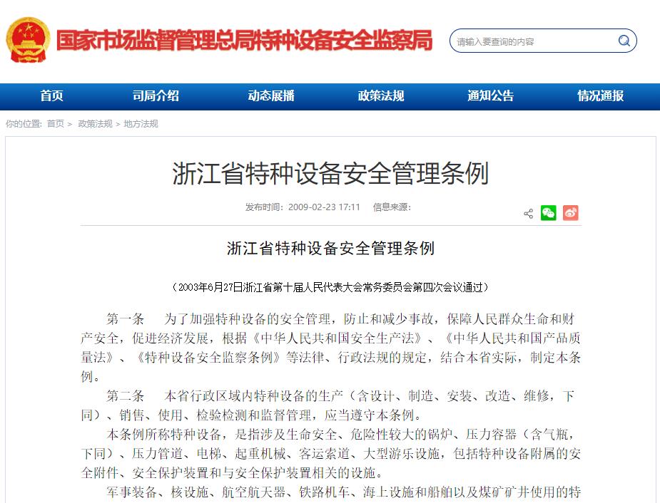 《浙江省特種設(shè)備安全管理條例》2003年6月27日浙江省第十屆人民代表大會常務(wù)委員會第四次會議通過